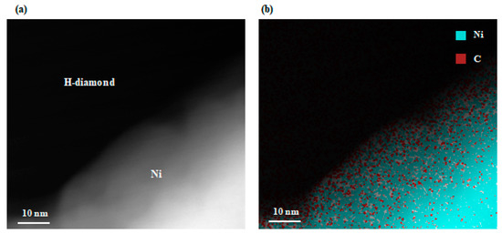 (a) Transmission electron microscope (TEM) and (b) energy dispersive spectrometer (EDS) images for the interface of the Ni/H-diamond after annealing at 900 °C, respectively.