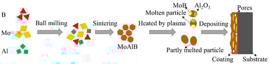 The schematic of the preparation of MoAlB powder and coatings is exhibited below in Figure 1. In this study, commercially available molybdenum (Mo, <2 μm, 99.5%, Rhawn, Shanghai, China), aluminum (Al, <30 μm, 99%, Rhawn, Shanghai, China) and boride (B, <20 μm, 99%, Rhawn, Shanghai, China) powders were used as raw materials. The Mo, Al and B powders were mixed in zirconia jars with a molar ratio of 1:1.5:1.3 [] using a planetary ball mill (YXQM-2L, Changsha Miqi Instrument Equipment Co., Ltd., Changsha, China). Ball milling lasted 10 h, the rotation rate was 300 rpm and alcohol was used as the dispersing agent. The micrographs of raw powders were characterized by a scanning electron microscope (SEM, S-3400N, Hitachi Incorporation, Tokyo, Japan) and are shown in Figure 2. B powder was not characterized because of its strong oxidizability.
