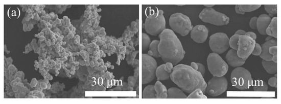 The mixture was dried at 100 °C for 12 h in a vacuum oven. After drying, the mixed powder was obtained and then heated in an Al2O3 crucible under flowing Ar at 1100 °C [,,] for 6 h using an atmosphere furnace (AF1400, Kunshan Aikexun Machinery Co., Ltd., Suzhou, China) to form MoAlB ceramic. The block ceramics were crushed and milled at a speed of 300 rpm for 1 h into MoAlB powder. In order to improve the flowability [], the MoAlB powder was granulated using an aqueous solution of 5 wt.% polyvinyl alcohol (PVA) then dried in a vacuum oven at 100 °C for 5 h. Finally, the powder with a particle size of 35–75 µm was sieved out using 200 and 400 mesh sieves for APS.