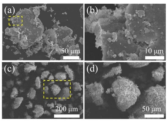 SEM micrographs of powders: (a,b) after ball milling; (c,d) after granulation.