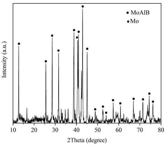 Figure 4a,b shows the morphologies of the mixed powders after ball milling. The Al powder became flaky with Mo and B powder homogeneously distributed on it. Figure 4c,d shows that the MoAlB powder after granulation was polygonal in shape with a size distribution from 35 to 70 µm. The XRD pattern of the feedstock powder (Figure 5) revealed that the MoAlB ceramic was formed after sintering at 1100 °C [,] with some residual Mo phase.
