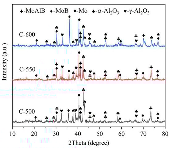 Figure 6 displays the XRD patterns of the MoAlB coatings deposited with different powers. The patterns reveal that MoAlB, MoB, Mo and Al2O3 phases were present in the three coatings, which indicates that the MoAlB ceramic partially decomposed and transformed into MoB and Al2O3 due to the higher temperature at the center position of the plasma than that at the edge [,]. However, the peak intensity of MoB in C-600 was significantly higher than those of C-500 and C-550, indicating that with the increase of power, the decomposition of MoAlB accelerated fast. The Al2O3 phase was composed of stable α-Al2O3, metastable γ-Al2O3 and amorphous Al2O3 in the three coatings. This is in good agreement with the results reported by Misra et al. [,]. The content of γ-Al2O3 in the coatings rose with the arc power, which indicates that more MoAlB decomposed and suffered a rapid solidification during the deposition process [].