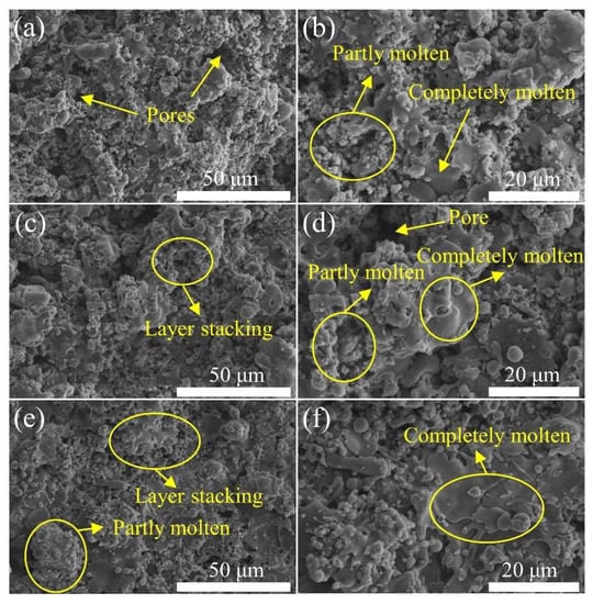 Surface morphologies of the deposited MoAlB ceramic coatings with different spraying parameters are shown in Figure 7. The surfaces of C-500 and C-600 were mainly composed of unmolten or semimolten particles, with little completely molten powder, and the powder spreading was poor. Therefore, there were a large number of holes and pores formed in the coatings. The surface of C-600 showed full powder spreading with fewer semimolten particles, and the pores were smaller and fewer. These result in a denser coating with a stronger bonding strength [,,].