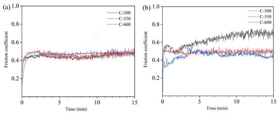 Figure 10a,b displays the variation of the friction coefficients of various coatings with sliding time against GCr15 and Si3N4 balls, respectively. The friction coefficients of both coatings reached a relatively stable stage after a short period of running-in. The stable friction coefficients against GCr15 varied (Figure 10a) in the range of 0.4–0.5. However, the friction coefficient curve of C-600 was steadier than those of C-500 and C-550. Large pores and unevenly distributed unmolten and partly molten particles in the coatings caused the fluctuation of the friction coefficient []. In contrast, C-600 is dense and the phases are uniformly distributed in lamellar structure [], so the friction coefficient curve of C-600 was steadier. Figure 10b exhibits the friction coefficient curves of the three coatings against Si3N4 counterparts. The average friction coefficients decreased with the arc power, and C-600 presented the lowest average friction coefficient of 0.46. The friction coefficient curve of C-500 continued to rise after the running-in period and eventually stabilized at about 0.7.