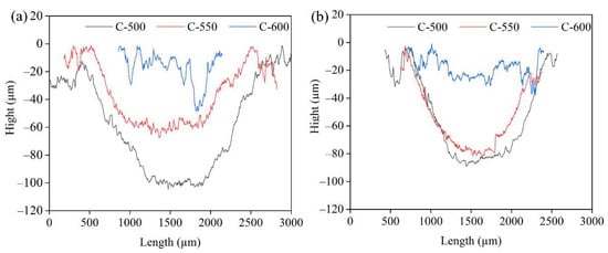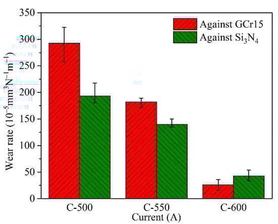 Figure 11 displays the profile curves of wear tracks of the three coatings against GCr15 and Si3N4 balls, respectively. It is obvious from Figure 11 that the depth of wear tracks gradually decreased with the arc power, and C-600 showed the lowest depth and width. The wear rates of the MoAlB coatings against GCr15 and Si3N4 are presented in Figure 12. With the increase of power, the wear rate shows a significant trend of decrease. The wear rates of C-600 against GCr15 and Si3N4 reach minimum values of 26.30 × 10−5 mm3∙N−1m−1 and 42.89 × 10−5 mm3∙N−1m−1, respectively. These results reveal that the wear resistance of the MoAlB coatings increased with the arc power. It can be attributed to the dense coating and high hardness and wear resistance of the decomposition phases. Moreover, the tribological behaviors of C-500 and C-550 against Si3N4 counterparts were superior to those against GCr15 balls. However, the wear rate of C-600 against Si3N4 was higher than that against GCr15, which corresponds well with the results of previous studies [,].