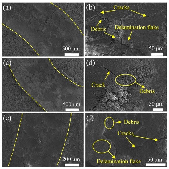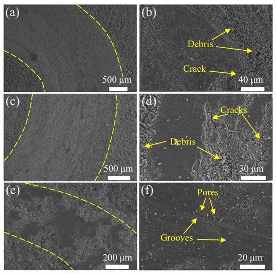 Surface images of the wear tracks of MoAlB coatings against GCr15 are shown in Figure 13. A lot of debris and small areas of the smooth surface were found on the wear tracks of C-500 and C-550, as shown in Figure 13a,c. Moreover, the high content of Fe, which was transferred from the GCr15 counterparts to the coatings, was found on the worn surface (Table 2). It is reasonable to conclude that the wear mechanism of C-500 and C-550 against GCr15 was mainly severe abrasive and adhesive wear. From the high-magnification image (Figure 13b,d), it can be seen that there were more cracks and pores on the smooth area of C-500 than that of C-550. However, the worn surface of C-600 (Figure 13e,f) displays larger areas of the smooth surface with some grooves, which is significantly different from C-500 and C-550. Moreover, the smooth areas consisted of Mo-Fe-Cr-O tribo-oxidative production (Table 2), which greatly improved the wear resistance of C-600. Therefore, the wear mechanisms were transformed from severe abrasive and adhesive wear to slight abrasive and adhesive wear as the power increased from 30 and 33 kW to 36 kW. The differences of worn surfaces were possibly attributed to the different bonding strength between splats caused by the inconsistent melting and deformation of the powder. Severe abrasive wear of C-500 and C-550 was mainly caused by the weak interfacial bonding strength between the splats and high porosity. The particles in the coatings are easily dislodged to form debris, which aggravated the wear []. When the arc power improved, the deposited coatings were denser, and the bonding strength between particles was stronger, which could effectively protect the substrate from abrasion wear. Moreover, the content of MoB and Al2O3 rose with the arc power, and their high hardness and wear resistance contribute a lot to the enhancement of the wear resistance of the MoAlB coatings.
