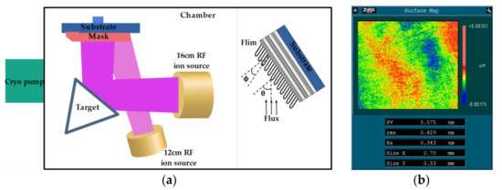 In this study, broadband AR coatings were fabricated using the dual ion beam sputtering process. Because of the high energy of deposited particles during preparation, the films prepared by DIBS have excellent optical stability, environmental stability, and repeatability. The Veeco’s (New York, NY, USA) SPECTOR DIBS optical coating system is shown in Figure 1a. Ta2O5 and SiO2 were used as high- and low-refractive index coating materials, respectively. The deposition rate of the film material was determined by the sputtering power of the 16 cm RF ion source and the shielding ratio of the mask. The sputtering distribution of the film material depends on the incident angle of the ion beam relative to the target and the sputtering characteristics of the film material. In the process of thin-film deposition, O2 should be supplied to the 12 cm auxiliary ion source to ensure the proper degree of oxidation for the film materials. The deposition rate of Ta2O5 was 0.23 Å/s, and the deposition rate of SiO2 was 0.34 Å/s. The rate was very stable over 1–2 h of coating deposition process. Owing to its excellent stability, we used a precise time controlling method to prepare the multilayer AR coating. Precision-polished sapphire glasses with a size of 1 inch were used as the substrate material. The glasses have an extremely low surface roughness Ra, much lower than conventional glass materials. The surface roughness was measured by an interferometric optical profiler after native oxide removal and cleaning. Precision grade (Ra < 1 nm) roughness for optical grade substrates plays a key role in deposition since the substrate surface has a direct effect on the adhesion and agglomeration of the films deposited. The average surface roughness (Ra) was determined to be 0.343 nm as shown in Figure 1b. The substrate clamping device used in the coating process is a high-speed rotating planetary fixture having a precisely tested and processed uniformity correction baffle. The thickness uniformity error of the film on the surface of the 1-inch substrate was better than ±0.1%. Therefore, the influence of the film’s lateral uniformity on its antireflection performance on the substrate surface can be ignored. Prior to deposition, the samples were cleaned in acetone and methanol, rinsed in de-ionized water, and subsequently dried in a stream of nitrogen gas. Then, they were fixed on a rotated plane fixture located in a position that faced the coating material target. The substrate temperature was heated and kept at 200 °C by a heater in the vacuum chamber during the entire deposition process. The obliquely deposited porous SiO2 layer was prepared by changing the deposition angle (θ) between the plane and vapor source.