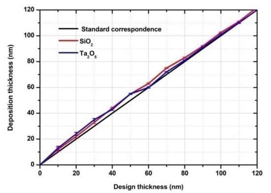 The refractive index of the material was calculated by applying the measurement data of the ellipsometer. In the investigation band, data were collected in 1 nm intervals. The refractive index data were relatively sufficient for our calculations, which was the main reason for not using the spectral measurement calculation method to obtain the refractive index of coating materials. There was a large deviation in the refractive index of the coating material between short and long wavelengths. Sufficient refractive index data can improve the accuracy of film optimization, which is more critical for shortwave design. In the shorter band, the transmittance curve had more ripples, and a slight deviation of the refractive index caused the transmittance of some wavelengths to be much lower than average. According to the coating experiment, the thickness difference of the broadband AR thin film layers sis very large. In addition to accurately measuring the refractive index of the material, the thickness deviation correction of the film was also one of the key factors in improving the accuracy of the deposition. Figure 3 shows the correspondence between design thickness and deposition thickness. The standard correspondence relationship should be one to one. However, there was another calculation error about film thickness which is a function of time. Because the shutter was switched on and off when changing layer during deposition, the film’s deposition was nonlinear, this is a significant error between the designed film thickness and the actual thickness. Furthermore, through multiple experiments, the error bar of film layers with different design thicknesses and an average value was obtained. In the subsequent multi-layer film design process, the thickness correction data obtained was employed to improve design accuracy.