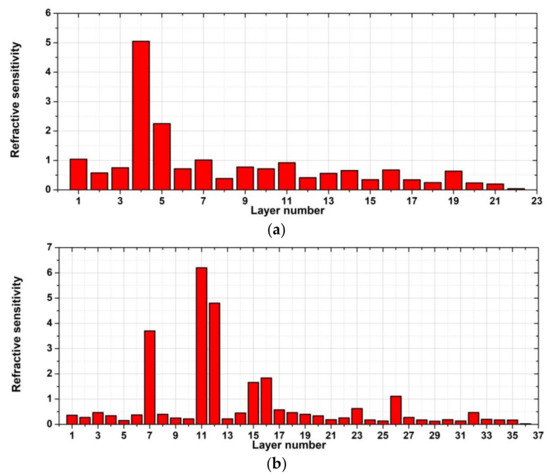 Figure 5a,b shows the relative sensitivity of the two designed coating stacks. The film layers that had a significant influence on transmittance were second and fifth layers. Because the ultrathin layer has a greater thickness error rate, we coordinated the relationship between the sensitive and the ultrathin layers to obtain a design result with higher accuracy for the thickness control of the sensitive layer. In addition to adjusting the design of the sensitivity layer to improve manufacturing accuracy, a low-rate coating was actually used for the film layer having higher sensitivity [33]. Correspondingly, the refractive index of the film layer with a reduced deposition rate was recalibrated by the ellipsometer, and the thickness error was corrected. When analyzing the relative sensitivity of the film, it was found that the thickness error of the top OAD film layer had little effect on transmittance, but the slight error of its refractive index had a significant impact on overall transmittance. Therefore, the preparation process of OAD needs detailed calculation and analysis to ensure that the refractive index of the porous SiO2 is stable and accurate.