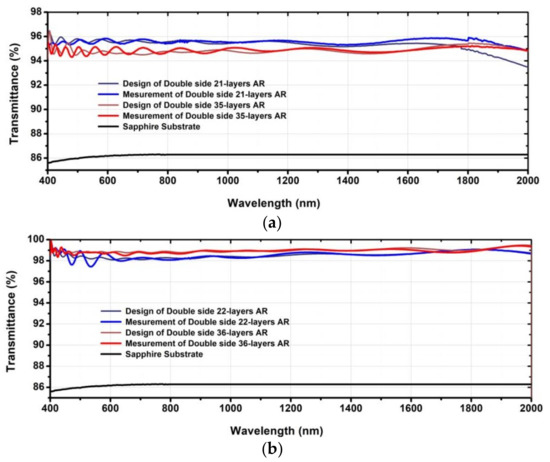 In summary, our results indicated that it is possible to significantly decrease surface reflectance for a broadband using a design that combines the OAD film layer and a multi-layer optical coating. Precise time-controlled and oblique-angle deposition (OAD) methods were used to manufacture broadband AR coatings. By accurately measuring the thickness error of the film layer, adjusting the relative sensitivity distribution of the film layer with the film stack, and optimizing the film design results and preparation parameters, the 22-layer and 36-layer anti-reflection films coated on both sides of the sapphire substrate were finally realized. The test data and theoretical calculation results of the two types of broadband AR coatings were basically the same. The highest average transmittance in the range of 400–2000 nm was 99.11%. This bottom-up preparation process and hybrid coating structure have the potential to significantly improve the broadband anti-reflection performance of many optical systems that require high transparency. It is expected to reduce the manufacturing cost of preparing broadband AR coatings.