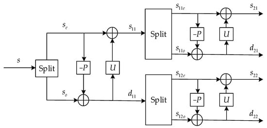 The lifting scheme wavelet transform (LSWT) is based on the traditional Laurent polynomial and Euclidean algorithm. By improving wavelet and scaling functions with known characteristics, a new set of wavelet and scaling functions with certain desired characteristics are obtained. The lifting scheme algorithm uses a simple and effective way to construct biorthogonal wavelets. First, basic polynomial interpolation is used to obtain the high-frequency components of the information, and then a scaling function is constructed to obtain the low-frequency components. The theme of this LSWT algorithm is to decompose the existing wavelet filter into basic building blocks and then complete the wavelet transform according to the corresponding steps. LSWT divides the wavelet transform into three steps: Split, Predict, and Update. The two-stage decomposition is shown in Figure 1.