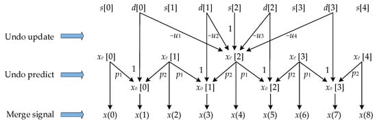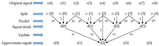 For example, when the predictor coefficient is and the updater coefficient is , the LSWT decomposition process based on the principle of interpolation and subdivision is shown in Figure 2.
