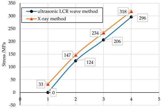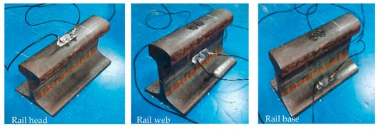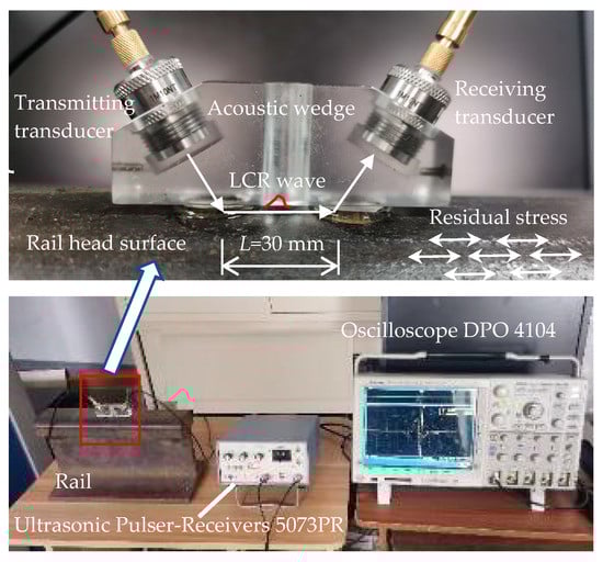 Residual stresses in the surface layer of steel rails are generated during production and use. In particular, the residual stresses in the protective coating [1] of steel rails are created at a specific technological process. Excessive residual stresses affect the stability, wear resistance, fatigue strength, and fracture resistance of the rails during use, and even cause the rails to break, which constitutes a huge impact on driving safety and potential threat. Studies have shown that there are usually longitudinal tensile residual stresses at the head and base of the rail, and longitudinal compressive residual stresses at the rail web. The ultrasonic measurement of residual stress is based on the theory of acoustoelasticity, using the ideal linear relationship between the velocity of ultrasonic wave in the elastic medium or the change of the frequency spectrum and the internal stress of the elastic medium to measure [2,3,4]. In order to relate ultrasonic velocities to residual stress, the ultrasonic method generally requires higher-order elastic constants [5]. These constants which are also dependent on the metallurgical texture [6], the type of wave and the direction of wave propagation relative to the direction of stress [7] must be experimentally determined for a particular material being examined. The influence of the texture on the measured transition times should be considered during data analysis.