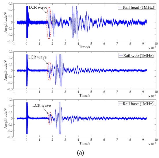 As shown in Figure 6, the ultrasonic probes of 1 MHz, 2.5 MHz, and 5 MHz are used to measure the residual stress at the rail head, rail web, and rail base respectively. The high-pass filter (HPF) of the ultrasonic pulser-receivers is set to “OUT”, and the low-pass filter (LPF) is set to “20 MHz”. The “Acquisition” of the oscilloscope is set to “sampling” and no averaging is performed. The sampling frequency is 2.5 GHz, the data length is 250,000, and the nine groups of original signals collected are shown in Figure 7. In each group of signals in Figure 7, the leftmost waveform is the trigger signal sent by the transmitting transducer, and the right waveform is the signal received by the receiving transducer. Since the LCR wave is a longitudinal wave that propagates parallel to the surface of the rail as shown in Figure 6, it has the fastest propagation velocity and first reaches the receiving transducer, so it will appear on the leftmost (front end) of the right waveform. The following series of waveforms are transverse waves or longitudinal waves that reach the receiving transducer after being reflected by reflection interfaces such as the bottom and sides of the rail.