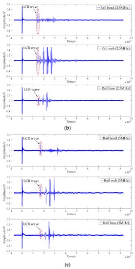The original signals of rail head, rail web, and rail base by using ultrasonic transducers with the frequency of (a) 1 MHz; (b) 2.5 MHz; (c) 5 MHz.
