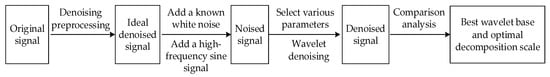 The selection of the optimal wavelet base is mainly based on the comparison of the results before and after the LSWPT denoising processing. However, in practical applications, the LCR wave signals collected as shown in Figure 7 are usually noise-containing signals, and it is impossible to obtain a real signal without noise. Therefore, it is difficult to accurately evaluate the quality of the wavelet base. An ideal signal can be constructed by preprocessing a noisy LCR wave signal, for example, smoothing the noised signal. Then superimpose a known white noise and a high-frequency sinusoidal signal on this ideal signal. The finally formed signal will be used as the original signal for evaluating the denoising ability of the combination of wavelet base and decomposition levels. The specific implementation method is shown in Figure 8. The reason for adding a high-frequency sinusoidal signal is to consider the nonlinear effect of LCR wave propagation in materials with residual stress [26]. The LCR wave contains high-frequency harmonic signal components.