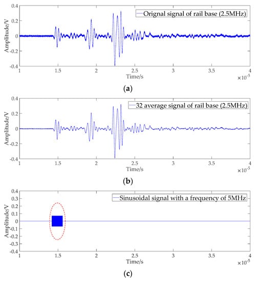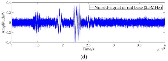 The LCR wave signal (2.5 MHz) with a smaller amplitude and measuring the residual stress at the rail base is selected as the original signal for verification and analysis. As shown in Figure 9a, we can take the 10–40 μs part of the original signal with the length of 75,000 out, the perform 32-time average filter processing on this original signal to obtain an ideal signal with LCR wave for residual stress measurement at the rail base, as shown in Figure 9b. A standard Gaussian white noise is superimposed on the entire original signal, and a high-frequency sinusoidal signal with a frequency of 5 MHz is superimposed on the LCR wave separately to construct a test signal containing noise and high-frequency information, as shown in Figure 9c. The SNR of the test signal is 4.3208 dB.