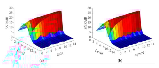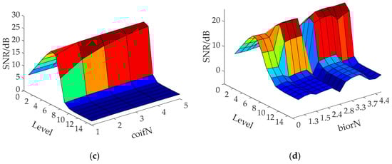 The signal-to-noise ratio (SNR) of denoise processing by: (a) dbN; (b) symN; (c) coifN; (d) biorNr.Nd.