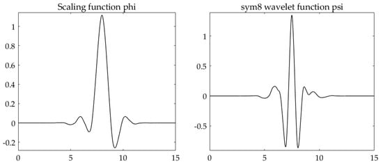 In this section, we will use the method of combining the above four wavelet functions and different decomposition levels to denoise the constructed noisy signal. According to the results before and after processing, find the optimal wavelet base and the best decomposition level. From the SNR results of the four wavelet denoising shown in Figure 10, it can be seen that sym8 can be used as the best wavelet base, and the best decomposition level is 8. The scaling function and wavelet function of sym8 are shown in Figure 11. It should be noted that the number of levels of wavelet decomposition and reconstruction is not the more the better. More levels will lose some details, while fewer levels will not be able to effectively remove noise.