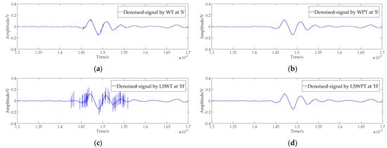 The results in Table 1 show that the four denoising methods based on wavelet analysis achieved the purpose of denoising well, and the SNRs are significantly improved. The calculation time of LSWT and LSWPT is shorter than that of traditional WT and WPT respectively, which reflects the advantages of the lifting scheme (LS) in denoising efficiency. Under the soft thresholding processing, both WT and WPT methods can effectively remove the noise of the LCR wave signal, as shown in Figure 12a,b. However, the LCR signal denoised by the WT method has some burrs affected by the high-frequency sinusoidal signal, while the WPT method effectively removes the high-frequency noise and makes the LCR signal smoother and closer to the ideal signal. Comparing Figure 12c,d, as well as the results in Table 1, it can be seen that under the hard thresholding processing, the WT and LSWT methods are ineffective against the interference of high-frequency noise, while the WPT and LSPT methods are very effective, which illustrates the advantages of wavelet packet denoising.