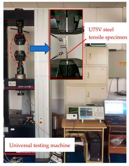 It is necessary to calibrate the ultrasonic equipment, we can adopt an absolute calibration method to calibrate the ultrasonic testing equipment with a universal testing machine, as shown in Figure 13. The U75V rail steel tensile test specimen is directly removed from the rail by wire cutting for preparation. We performed uniaxial tensile tests on U75V specimens at room temperature and obtained different tensile stresses and corresponding strains of the specimens relative to the free state (assumed to be a zero-stress state). At the same time, the change of TOF is obtained according to the time-domain signal of the LCR wave under different tensile stresses, as shown in Figure 14. Then calculate the correlation coefficient between these LCR wave signals to obtain the time difference of each LCR wave signal. According to Equation (12), the stress coefficient is 10.149 MPa/ns, as shown in Figure 15. When the ultrasonic equipment is calibrated, the stress can be calculated based on this coefficient and the change in TOF, and compared with the known tensile stress, so as to achieve absolute calibration of the ultrasonic equipment. The universal testing machine can accurately obtain the stress and strain of the specimen under any different tensile stress within the elastic deformation range. At the same time, by using an oscilloscope with a sampling rate of 1 GHz or higher to collect LCR wave signals, it is possible to record and distinguish small changes of TOF very well. Therefore, this absolute calibration method can evaluate the effectiveness of the ultrasonic residual stress measurement method.