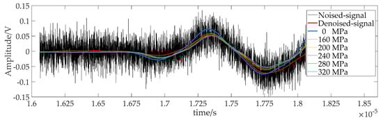 Similarly, we can add noise to the LCR wave signal (1 MHz) of the rail base as shown in Figure 7a, and then apply the LSWPT method for denoising processing to obtain the denoised signal shown in Figure 15. Cross-correlation calculations are performed on the noised signal and the denoised signal with the LCR wave signal of 0 MPa, respectively. The corresponding residual stresses are respectively 196.4756 MPa and 192.416 MPa, with an error of 2.11%, as shown in Figure 15. Therefore, by performing LSWPT denoising processing on the LCR signal, the accuracy of residual stress measurement can be effectively improved.