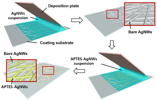 Prior to the fabrication of the AgNW films, the surface of the glass slides (25 mm × 75 mm with plain ends, Fisher Scientific, Waltham, MA, USA) was hydrophilized and cleaned with piranha solution for 2 h and washed thoroughly with deionized (DI) water. Subsequently, the glass slides were dried with nitrogen gas to remove the piranha solution left on the surface. Polyester (PE) film was used as the flexible coating substrate. PE films (SKC, Seoul, Korea) were cleaned with IPA and dried with nitrogen gas. Following this, the dried PE films were subjected to an air plasma (PDC-32G, Harrick Plasma, Ithaca, NY, USA) treatment at 18 W for 5 min to render their surfaces hydrophilic via oxygenation. All the APTES-AgNWs films were fabricated using the MDD technique [32]. The deposition plate was placed on the surface of the coating substrate making a wedge. The AgNW solution was injected into the wedge between the coating substrate and the deposition plate and trapped using a 20-μL capillary. The deposition plate, which was connected to a motorized stage (AL1-1515-3S, Micro Motion Technology, Incheon, Korea), moved back and forth at a speed of 16.7 mm/s. The coating process was repeated up to three times (number of coatings, NC = 1–3). In the case of the upper layer in the multilayer films, 8 μL of the APTES-AgNWs solution was injected into the wedge in the same way as mentioned above. The MDD coating process was repeated on the substrate coated with bare AgNWs at the same speed and NC = 1.