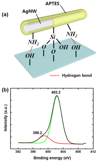 (a) Bonding between the APTES-AgNWs and glass substrate. (b) N1s XPS profiles of the APTES-AgNWs deposited on the glass substrate.