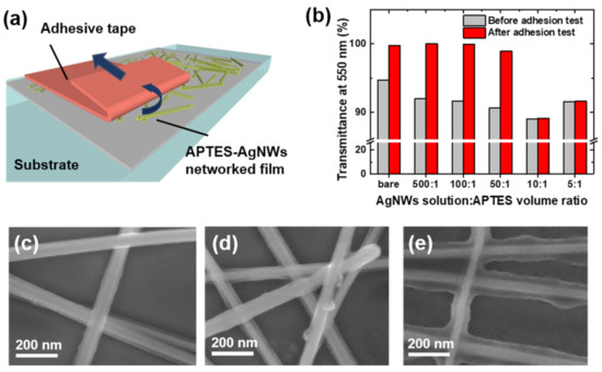 Further investigations involved the elucidation of the effect of the APTES concentration on the adhesion strength. The APTES treatment of AgNWs was carried out by adding APTES to the AgNW dispersion in various volume ratios (AgNWs solution:APTES = 500:1, 100:1, 50:1, 10:1, 5:1) at a fixed AgNW concentration of 0.5 wt.%. Adhesion strength was evaluated by comparing transmittance at 550 nm before and after a peel-off test for APTES-AgNWs networked films, as shown in Figure 4a and the result is summarized in Figure 4b. When the volume ratio of AgNWs solution:APTES is lower than 10:1, the transmittance of APTES-AgNWs networked film was greatly increased after the peel-off test, resulting from the significant delamination of APTES-AgNWs. In contrast, as the volume ratio of AgNWs solution:ATPES exceeds 10:1, the transmittance of the APTES-AgNWs film remains constant after the peel-off test, thus confirming the enhancement of adhesion by the APTES treatment. The corresponding FE-SEM images in Figure 4c and e illustrate the effect of the APTES treatment on the adhesion strength. At the AgNW solution:APTES volume ratio of 10:1, the surface of the AgNWs was sufficiently covered with APTES. However, at the AgNWs solution:APTES volume ratio of 100:1, the APTES exhibited an island-like growth on the surface of the AgNWs. Hence, the AgNWs were not sufficiently covered with the APTES. In addition, APTES was not observed on the surface of the AgNWs treated at the AgNW solution:APTES volume ratio of 500:1.