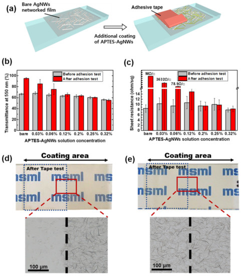 The effect of the APTES-AgNWs solution concentration on the adhesion strength of APTES-AgNWs/AgNWs composite films was also investigated at a fixed APTES treatment condition (AgNW solution:APTES volume ratio = 10:1). As shown in Figure 5a, the bare AgNWs were coated on the substrate and the APTES-AgNWs were coated on the pre-deposited AgNWs networked film. Following this, the adhesion strength of the APTES-AgNWs/AgNWs composite film was evaluated by comparing the transmittance of the composite film before and after the peel-off test. The concentration of APTES-AgNWs is varied between 0 wt.% and 0.32 wt.% and the results are summarized in Figure 5b,c. It is evident from the results that before the peel-off test, the transmittance of the APTES-AgNWs/AgNWs composite film only decreases slightly with increasing ATPES-AgNWs concentration. Meanwhile, the sheet resistance remains constant, thus indicating that ATPES-AgNWs do not contribute to the electrical conductivity and transmittance. However, after the peel-off test, the transmittance and sheet resistance are greatly increased at APTES-AgNWs concentrations lower than 0.2%. This is ascribed to the significant delamination of the APTES-AgNWs/AgNWs composite films. As Figure 5d shows, most AgNWs are delaminated after the peel-off test. In contrast, when the concentration of APTES-AgNWs is equal to or higher than 0.2%, as Figure 5e shows, the APTES-AgNWs/AgNWs composite film is hardly delaminated after the peel-off test and the transmittance and sheet resistance remain unchanged, indicating the enhancement of adhesion strength.