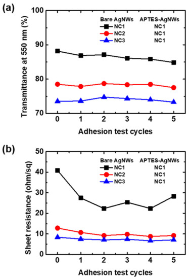 The effect of the bare AgNWs deposition condition on the adhesion of APTES-AgNWs/AgNWs composite films was investigated. The deposition amount of bare AgNWs was controlled by increasing the NC from 1 to 3, followed by the deposition of the APTES-AgNWs with NC = 1. The result is summarized in Figure 6. The transmittance at 550 nm and the sheet resistance of the films decreased with increasing NC of the bare AgNWs, resulting from the more densely networked AgNWs layer. The adhesion test was repeated five times for each sample and no change was observed in the transmittance at 550 nm, indicating that APTES-AgNWs/AgNWs composite films are appreciably adhered to the substrate. It is evident from Figure 6b that the sheet resistance of the films decreased after the first peel-off test. It is attributed to the fact that the pressure applied during the peel-off test improved the contact in the junctions between the AgNWs, thus reducing the electrical resistance between the AgNWs [36]. Although there is little fluctuation of sheet resistance in the film with NC = 1 for bare AgNWs, the AgNWs thin films exhibit great adhesion to the glass slide even after the repetition of the peel-off test five times.