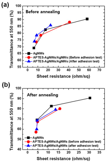 where is the optical conductivity and is the DC conductivity of the metallic thin films. As is evident from Figure 7a, the transmittance and sheet resistance values of the APTES-AgNWs/AgNWs composite film are similar to those of the AgNWs networked film without an APTES-AgNWs layer under a wide range of sheet resistance values. This indicates that the adhesion strength is effectively improved, thus minimizing the loss of conductivity and transmittance. The highest FoM values for each group were calculated to be 152.4 for AgNWs and 135.0 and 174.4 for APTES-AgNWs/AgNWs composite films before and after the adhesion test, respectively. As previously discussed, the increase in FoM after the adhesion test is a result of the welding effect arising from the applied pressure during the adhesion test. The electrical conductivity of the AgNW-based electrodes can be increased using thermal annealing. The annealing was carried out 180 °C for 5 min, the results of which are summarized in Figure 7b. The highest FoM values of the annealed bare AgNWs films, APTES-AgNWs/AgNWs composite film before adhesion test, and APTES-AgNWs/AgNWs composite films after the adhesion test are calculated to be 201, 177, and 195, respectively. This increase of FoM after annealing is ascribed to the melting of the PVP capping layer of the AgNWs surface, thus reducing the resistance of the junctions between the wires [32].
