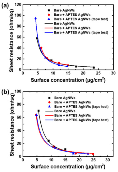 where is the surface resistance, is surface concentration, is the percolation threshold, and is the percolation exponent [37]. The fitted line of Equation (2) is also shown in the graphs. The values of the bare AgNWs films, APTES-AgNWs/AgNWs composite films, and APTES-AgNWs/AgNWs composite films after the peel-off test (Figure 8a) were calculated to be 2.81, 3.48, and 2.32 μg/cm2, respectively. The values of the annealed bare AgNW films, APTES-AgNWs/AgNWs composite films, and APTES-AgNWs/AgNWs composite films after the peel-off test were 2.12, 2.85, and 2.14 μg/cm2, respectively (Figure 8b). The smaller values indicate that the electrical connections between each of the AgNWs are improved after annealing, resulting in an increase in conductivity. The α value, which indicates the dimensionality of the films, is close to 1.33 (the values of the α varied from 1.01 to 1.53 in this study), corresponding to the value of the two-dimensional conduction model cited in the literature. Overall, the trend of sheet resistance with respect to the surface concentration corresponds well with Equation (2) for all samples. This indicates the fabrication of well-structured AgNWs networked with wide-ranged controllability.