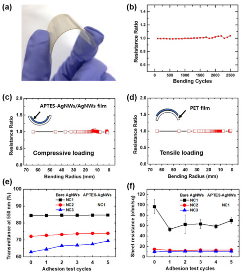 The adhesion test was employed to investigate the adhesion strength between the APTES-AgNWs/AgNWs composite and the PE substrate (Figure 9e,f). First, the bare AgNWs were coated on the plasma-treated PE substrate. Following this, the APTES-AgNWs were coated on the bare AgNWs and the peel-off test was carried out. The NC of the bare AgNWs was varied from 1 to 3. It is evident from Figure 9e that when the NC of the bare AgNWs was 1 and 2, the transmittance of the films did not change over the course of the test cycle. However, at NC = 3, the transparency of the films increased slightly with the repetition of the peel-off tests. This indicates that the adhesion between the APTES-AgNW layer and the substrate was poor because of the presence of a thick, bare AgNW layer. However, the NC = 3 sample maintained its sheet resistance even after multiple rounds of the peel-off test (Figure 9f). This was attributed to the delamination arising from the excess amounts of APTES-AgNWs, which do not contribute to the conductivity. The amine (–NH2) groups present in the APTES layer formed electrostatic bonds with the hydroxylated PE substrate, resulting in the strong adhesion between the APTES-AgNWs/AgNWs composite film and PE substrate [40]. Thus, flexible transparent conductive films with good adhesion were successfully fabricated by coating the APTES-AgNWs on the bare AgNWs.