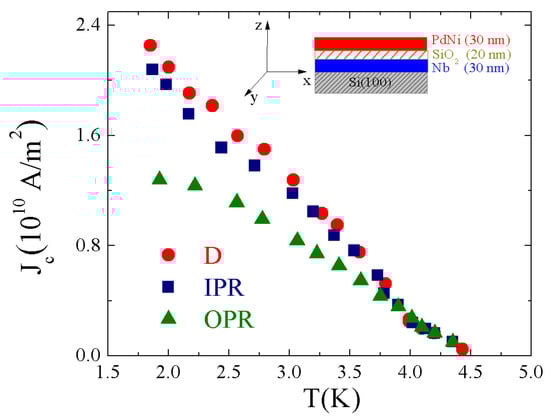 In the S/I/F system under study the superconducting and ferromagnetic layers of equal thickness dS = dF = 30 nm are separated by a 20-nm-thick SiO2 film. Here, PdNi is a dilute ferromagnetic alloy with composition Pd84Ni16, and Nb was used as a superconductor. The heterostructure is deposited on a Si(100) substrate by sputtering technique in three different steps. First, a layer of Nb was sputtered on a silicon substrate by dc magnetron. Then the SiO2 barrier was realized by RF sputtering (MRC 8602), breaking the vacuum. Afterwards, the final PdNi layer was deposited by dc sputtering [,]. A sketch of the resulting substrate/Nb/SiO2/PdNi trilayer is shown in the inset of Figure 1. Finally, the sample was patterned by lift-off into a strip of width w = 20 μm and length l = 300 μm. All the transport measurements were performed in a 4He cryostat by following the same procedure described in reference []. The Jc values were determined applying the 3 mV/m electric field criterion. The critical temperature of the trilayer is Tc ≈ 4.5 K, smaller when compared to the corresponding proximized Nb/PdNi hybrid investigated in reference [] (TcNb/PdNi ≈ 6 K). This result can be attributed to the vacuum breaking during the deposition and the lift-off procedure. The estimated low-temperature resistivity of the Nb film is ρ ≈ 20 μΩ·cm, while the superconducting coherence length is ~ 9–10 nm [], which results in a Ginzburg–Landau (GL) coherence length at T = 0 ~ 14–16 nm. This means that the ratio varies in the range 1–1.6 over the entire temperature range of measurements, so that the Nb layer can be considered as a thin film. Jc was measured as a function of the temperature for three different magnetic configurations of the PdNi layer. The demagnetized state (D) is reached by cooling the as-grown sample from room temperature without any applied magnetic field. The IPR (OPR) state is obtained by first warming the sample above the PdNi Curie temperature, TCurie ≈ 190 K [], then cooling it down to T = 4.2 K, and later applying a parallel (perpendicular) magnetic field well above the saturation field in order to magnetize the PdNi layer. Finally, the field is switched off. Jc(T) is always measured in the absence of the magnetic field. In Figure 1 we show the dependence of Jc as a function of T measured for the three magnetic states. It follows that the Jc(T) dependencies coincide for all states from Tc down to T ≈ 4 K. In addition, only a slight difference can be observed between the critical current densities in the D and IPR states for lower temperatures, while the OPR state is characterized by more reduced values of Jc. This result is radically different from the one reported in reference [], where a pronounced dependence of the Jc(T) values for the three different configurations was observed. In particular, the relation JcOPR < JcIPR < JcD was fulfilled in the entire measured temperature range.