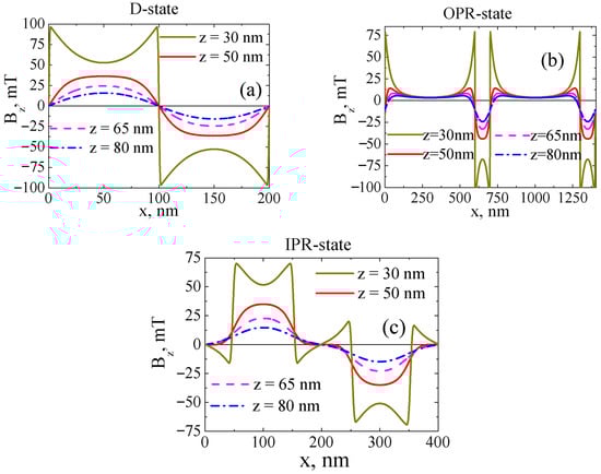 Distribution of the orthogonal component of the stray magnetic field Bz versus x for y = 0 in the D (a), OPR (b) and IPR (c) states of the PdNi film and for different values of z.