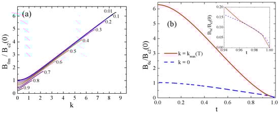 Moreover, important considerations can be derived by analyzing Figure 3b. First, the critical field B0c(T) is significantly larger than the upper critical field Bc2(T) over almost the entire temperature range. This result demonstrates that the definition of the critical parameters in a nonhomogeneous magnetic field is not trivial. Next, from Figure 3b we see that the critical state corresponds to kmax(T) ≠ 0 in the same T range. Finally, only in the immediate vicinity of TS, the value k = 0 gives the maximum to the function B0m(T; k), and this maximum almost coincides with Bc2(T). This result is presented in the inset of Figure 3b. In this temperature range our results almost coincide with the ones of reference []. It is clear in view of the fact that in the latter case (i.e., in the region of the applicability of the GL theory) and for small values of ν, Equation (1) reduces to the equation for the upper critical magnetic field.