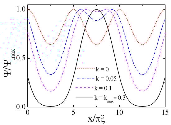 As follows from Figure 4, as soon as the superfluid velocity parameter k becomes non-zero, the topology of the wave function changes. Namely, from being d-periodic it becomes 2d-periodic with two adjacent maxima. Further, as the parameter k increases, the neighboring maxima of the wave function converge in pairs, with the minimum between them being smoothed out while the minimum between the pairs deepens. At last, at the critical point, kmax, two neighboring maxima merge, and the minima between the pairs touch the abscissa axis. Therefore, we can say that a 2d periodic lattice of superconducting phase nuclei is formed at the critical point. From a physical point of view, it means that, when the magnetic field amplitude increases above the value of Bc2(T), the condensate acquires a phase multiplier eiky/ξ, with a corresponding redistribution of the superconducting current, to minimize the effect of the magnetic field on the superconducting nuclei; this is a general property of inhomogeneous superconductivity.