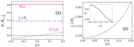 (a) The condensate wave function, Ψ, the critical current density, Jc, and the magnetic field induction Bx in the S-film. (b) The current distribution in the S film. Inset: the wave function Ψ in the region z > 0 on an enlarged scale. Hc is the thermodynamic critical field.