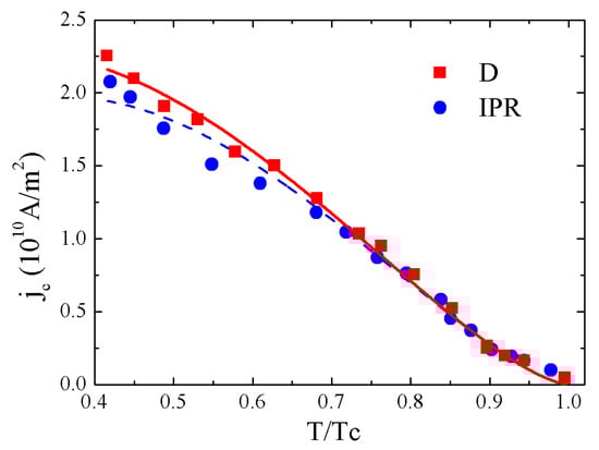 In accordance with Equation (4), for the relative difference ΔJc(T) = Jc,D(T) − Jc,IPR(T) of critical currents Jc,D(T) and Jc,IPR(T) describing D and IPR states, respectively, we estimate ΔJc(T)/Jc,D(T) ≈ 3φ0⋅(b0/νGL,D)2(1 − T/Tc) (here νGL,D = 2νGL,IPR). The result of the fitting procedure to the Equation (4) for Jc(T) for two states, D and IPR, is shown in Figure 5. It results that the proposed model reproduces the overlap of the Jc,D(T) and Jc,IPR(T) curves close to Tc and their small difference at low temperatures, with the critical current density for the D state laying above the one for the IPR state, as expected. It is worth underlining that the quantitative agreement of the theoretical dependences of the critical current density with the corresponding experimental characteristics can be achieved by the implementation of a theoretical model based on the formalism of the Usadel equations. The meaning of the estimations of the Jc(T) is that the observed equality of Jc close to Tc and difference when the temperature decreases can be easily explained by the interplay between the νGL,D(0) and νGL,IPR(0) on one side and the term (1 − T/Tc) in Equation (4) on the other side. When T tends to Tc, the difference between νGL,D(0) and νGL,IPR(0) can be neglected in Equation (4), whereas this is not true at low T. Thus the morphology of the stray field enters the temperature dependence of the critical current density in S/I/F hybrids. It is necessary to underline that the observed effect could be important in the vortex-free state. In this regard, we pay attention on the Jc,OPR(T) dependence in Figure 1, which was not fitted in Figure 6. In this case, it is difficult to talk about the vortex-free state, since we have a fairly large size of the “positive” domains and the stray field over the negative domains is quite large. As a result, the elementary model is not applicable, i.e., the consideration of this case does not fit the format of this work. This issue, together with the full theoretical explanation of the Jc,OPR(T) curve, will be the subject of a future work.