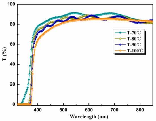 Higher average transmittance value in the visible range (400–800 nm) is advantageous for the transparent conducting films used as front electrodes. The effect of growth temperature on the optical properties of single-textured AZO films is studied. Figure 3 shows the total (specular + diffused) transmittance spectra of AZO films prepared at different hydrothermal temperatures. The highest average transmittance value is 88% in the visible range for T-70 °C sample, whereas the minimum average transmittance value is 82% for T-100 °C sample. Without the influence of glass substrates (transmittance of ~90%), the average total transmittance values of all the AZO films can be above 90%, which are helpful for the performance of solar cells. Though the average transmittance value decreases with increasing the growth temperature, it can still satisfy the application of transparent conducting films. Meanwhile, the absorption edge is red shifted in the ultraviolet region, which may be due to the increase of film thickness.