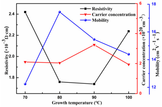 To characterize the electrical properties, the resistivity, carrier concentration and mobility of all the AZO films prepared at different growth temperatures are displayed in Figure 5. From the test results, all the AZO films exhibit n-type conductivity properties. With the increase of temperature, the carrier concentration is almost constant (~1020 cm−3). As is well known, the resistivity is inversely proportional to the mobility and the carrier concentration [21]. Because of the almost unchanged carrier concentration, the resistivity is mainly determined by the variation trend of the mobility. From Figure 5, as growth temperature rises from 70 °C to 100 °C, the mobility increases firstly and then decreases. As a result, the resistivity shows the opposite trend with the increasing temperature. The single-textured AZO films prepared at 70 °C display the minimum mobility. From the XRD results, we can see that the crystal qualities of the samples get better gradually with increasing the growth temperature. The improvement of the crystal quality can promote the reduction of defects in the films, and thus the impurity scattering is reduced. Therefore, the corresponding mobility can be effectively enhanced at higher growth temperature. In addition, when the growth temperature is increased from 80 °C to 100 °C, the mobility is slightly decreased. It can be seen from the SEM results that as the growth temperature rises from 80 °C to 100 °C, the surface roughness of the samples is increased due to the appearance of nanorod structures and gaps among the nanorods, which might lead to the slight decrease of mobility. The resistivities of all the AZO films keep the order of 10−3 Ω·cm and the resistivity of the AZO films prepared at 100 °C is 2.24 × 10−3 Ω·cm, which is suitable for application in the transparent front electrodes.