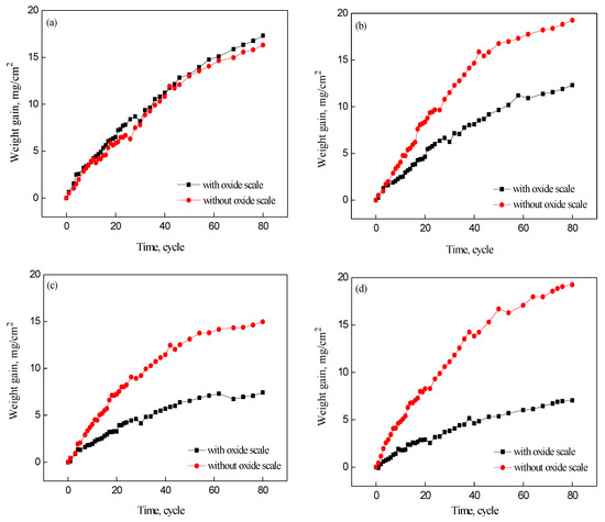 Relationship between weight gain and corrosion time for the samples with and without the oxide scale: (a) type I; (b) type II; (c) type III; (d) type IV.
