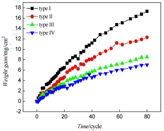 Figure 3 shows the relationship between the corrosion time and weight gain of the substrate steels with different oxide scale structures. The time and corrosion weight gains of the substrate steels exhibited a parabolic relationship. After 80 cycles, the corrosion weight gains of samples with types I, II, and III oxide scale were 2.46, 1.75, and 1.21 times that of types IV, respectively.