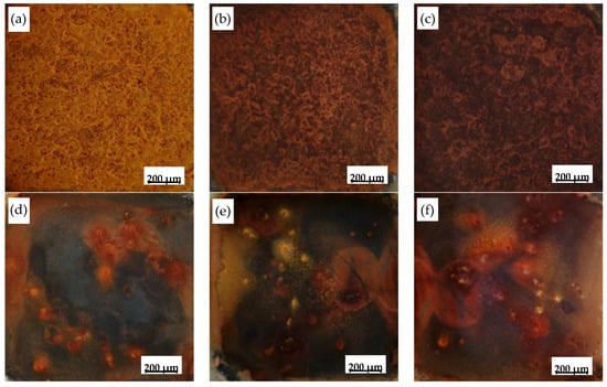 Surface macro-morphologies of type I (a−c) and type IV (d−f) oxide scale after different corrosion cycles: (a) and (d) 20 cycles; (b) and (e) 46 cycles; (c) and (f) 70 cycles.