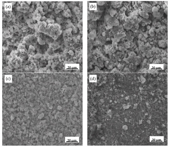 Figure 5 shows the SEM images of the corrosion products formed on the different oxide scales after 40 cycles. The surface morphology of the corrosion products formed on the four oxide scales were different. The corrosion products on the type I and II scales showed a loose structure with many cracks and micro-pores in the rust (Figure 5a,b). These cracks and micro-pores facilitated solution and oxygen from reaching the substrate. On the other hand, corrosion products with a compact and dense structure were formed on type III and IV oxide scale. The morphology of the surfaces on type III and IV scale were more homogeneous and finer than those on type I and II scales.