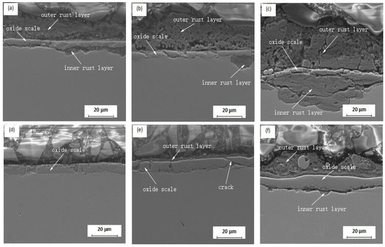 Cross-sectional morphology of rust on oxide scales after different cycles: (a) 20 cycles, type I; (b) 50 cycles, type I; (c) 70 cycles, type I; (d) 20 cycles, type IV; (e) 50 cycles, type IV; (f) 70 cycles, type.