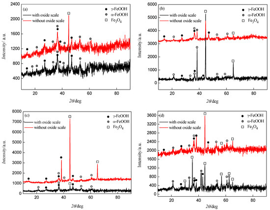 The composition of the rust layers, with and without oxide scale, was analyzed after 80 cycles using XRD. The XRD diffractograms given in Figure 7 showed that the rust layers were composed of γ-FeOOH, α-FeOOH and Fe3O4 [20]. Under the action of NaHSO3 solution, the anodic reactions occurring at the active zone in the initial wet–dry cycle corrosion test could be given by the following equations [19]: