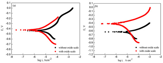 Figure 8 shows the potentiodynamic polarization curves obtained from steel electrodes, with and without oxide scale, in 3 wt% NaCl solution. The polarization experiments indicated that the corrosion potential and current of the oxide scale-covered electrodes were a combination of potential and current from the substrate and the oxide scale [20]. It was evident that there was a more positive corrosion potential for electrodes with oxide scale compared with electrodes without oxide scale. Furthermore, the corrosion current of the electrodes without oxide scale was higher than that of oxide scale-covered electrodes.