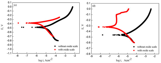 Potentiodynamic polarization curves of samples with and without oxide scale: (a) type I; (b) type II; (c) type III; (d) type IV.